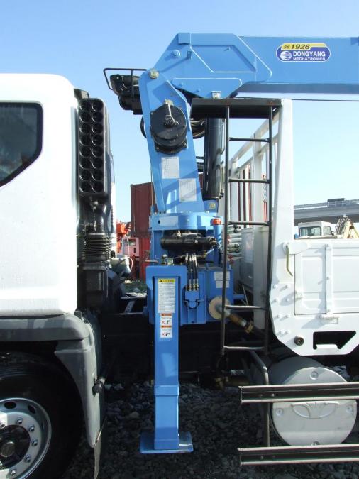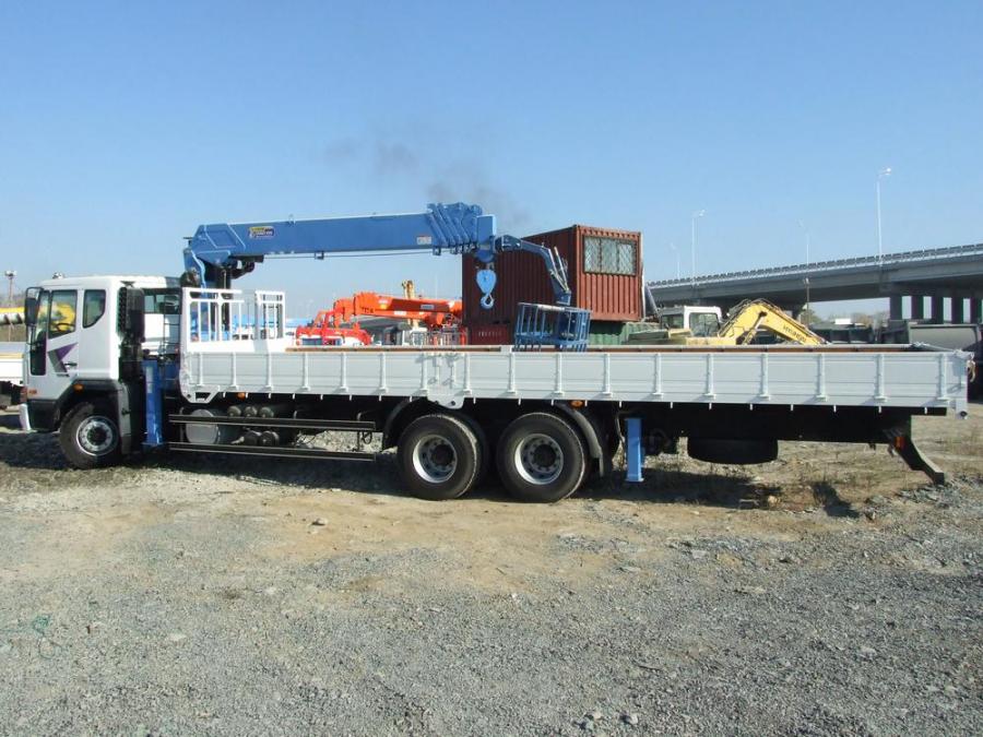 Бортовой грузовик с крановой установкой, 3 оси, грузоподъемность: борт - 15.5 т; стрела - 7 т. Длина борта - 9.50 м, ширина - 2.30 м. Новая двухцилиндровая стрела марки DONGYANG SS1926 , максимальная высота вылета - 23.3 м. Двигатель: дизель DV11, EURO-4, 420 л.с, 11000 см3. Шестиступенчатая коробка передач. Турботаймер. Бортовой самописец, система самодиагностики. Круиз-контроль, кондиционер, подогрев спальника. CD, MP3, USB, AUX. В комплект входит люлька. VIN - 0690