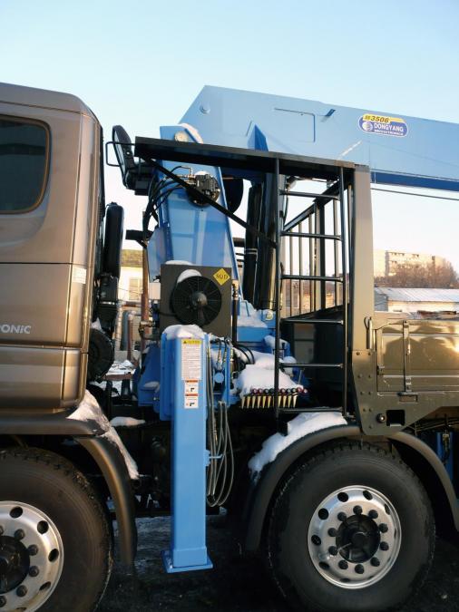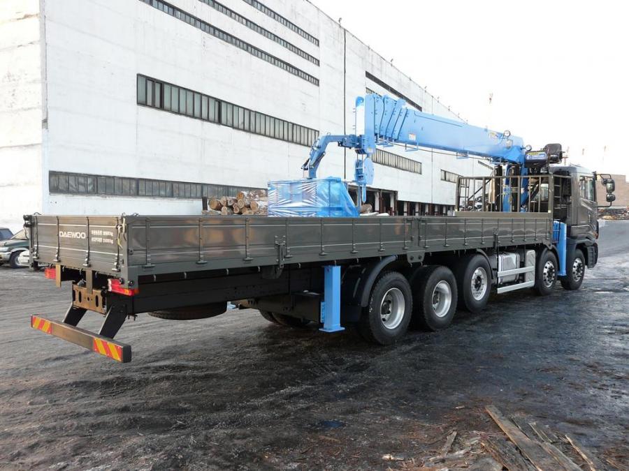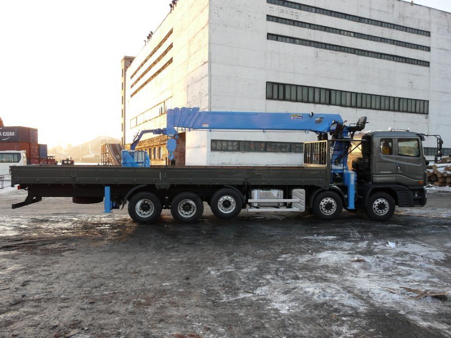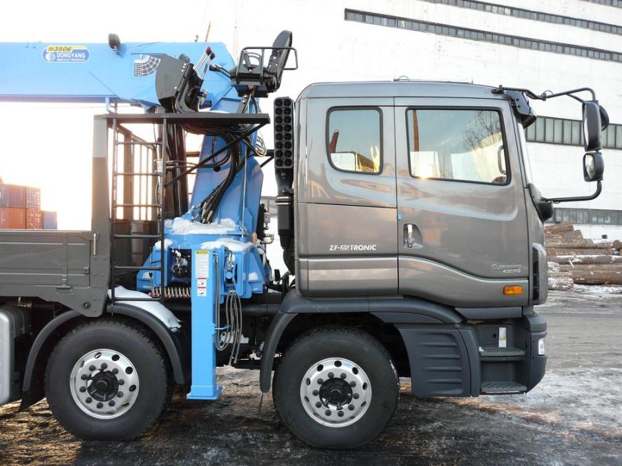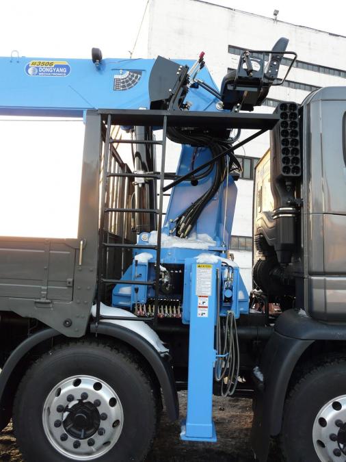 Бортовой грузовик с крановой установкой, 5 осей из них одна - ленивая, грузоподъемность: борт - 25 т; стрела - 15 т. Длина борта - 10.10 м, ширина - 2.30 м. Новая двухцилиндровая стрела марки DONGYANG SS3506, максимальная высота вылета - 28.20 м. Двигатель: дизель CUMMINS, EURO-4, 430 л.с, 12000 см3. Коробка - ZF-Astronic. Турботаймер. В комплект входит люлька.