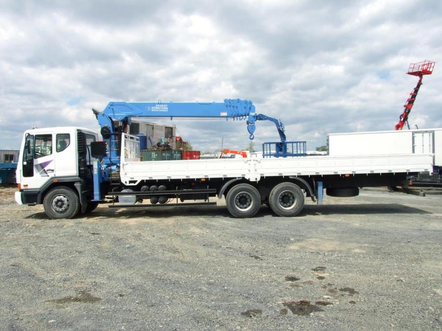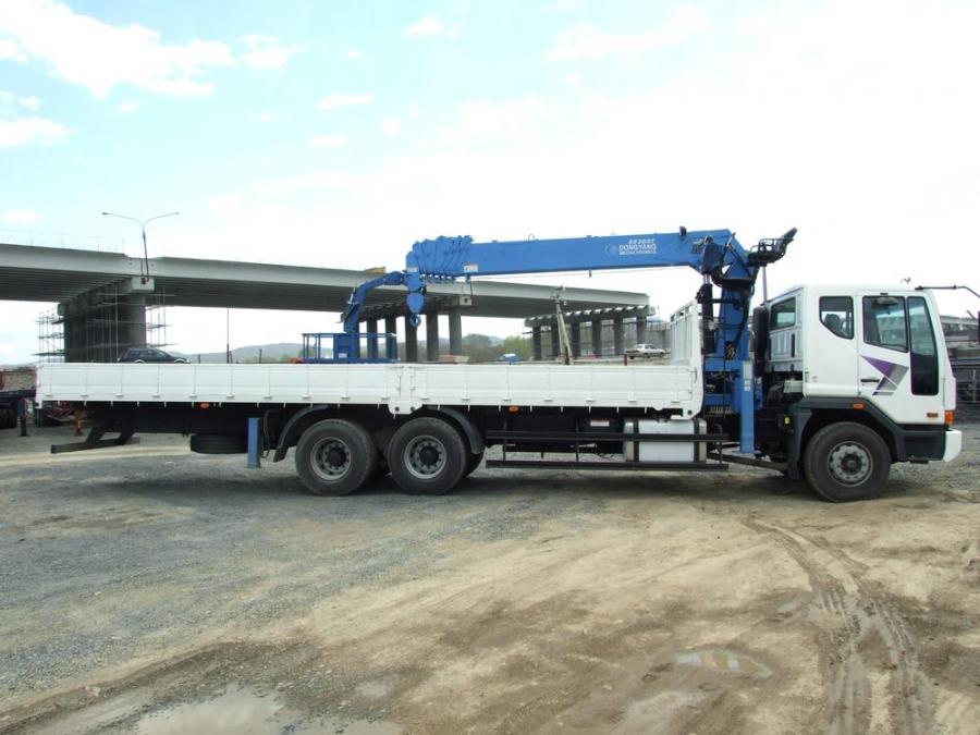 Бортовой грузовик с крановой установкой, 3 оси, грузоподъемность: борт - 15.5 т; стрела - 7 т. Длина борта - 9.5 м, ширина - 2.30 м. Новая двухцилиндровая «МИНУСОВАЯ» стрела с «ВЫСОКИМИ» аутригерами марки DONGYANG SS2037, максимальная высота вылета - 26 м. Двигатель: дизель DOOSAN, EURO-4, 420 л.с, 11000 см3. Шестиступенчатая коробка передач. Турботаймер. Количество мест - 2 + спальник. В комплект входит люлька. VIN - 0657
