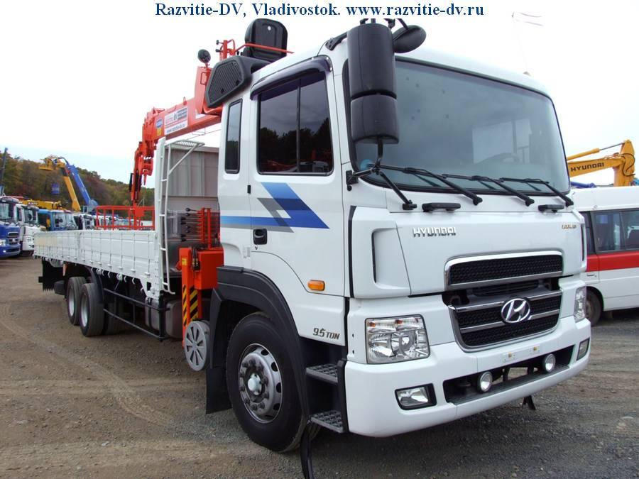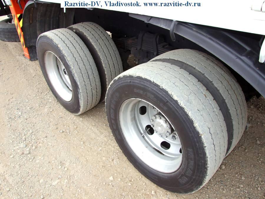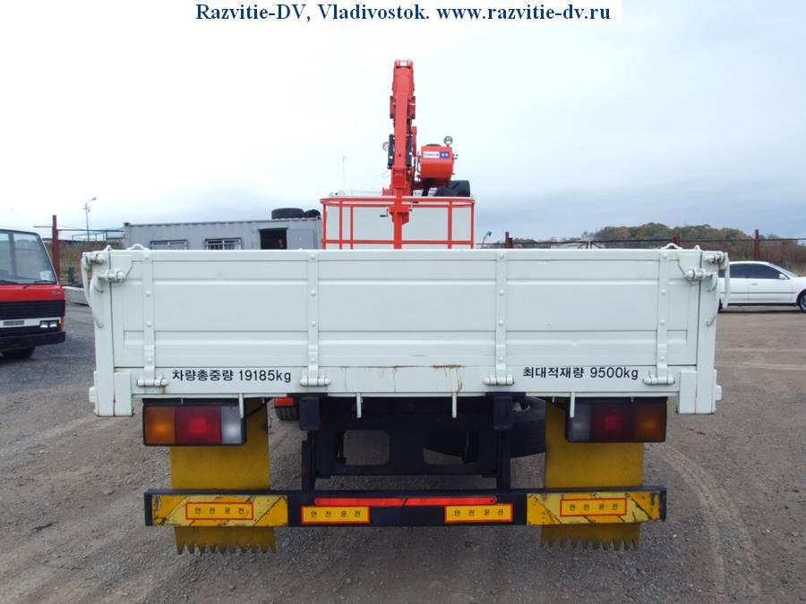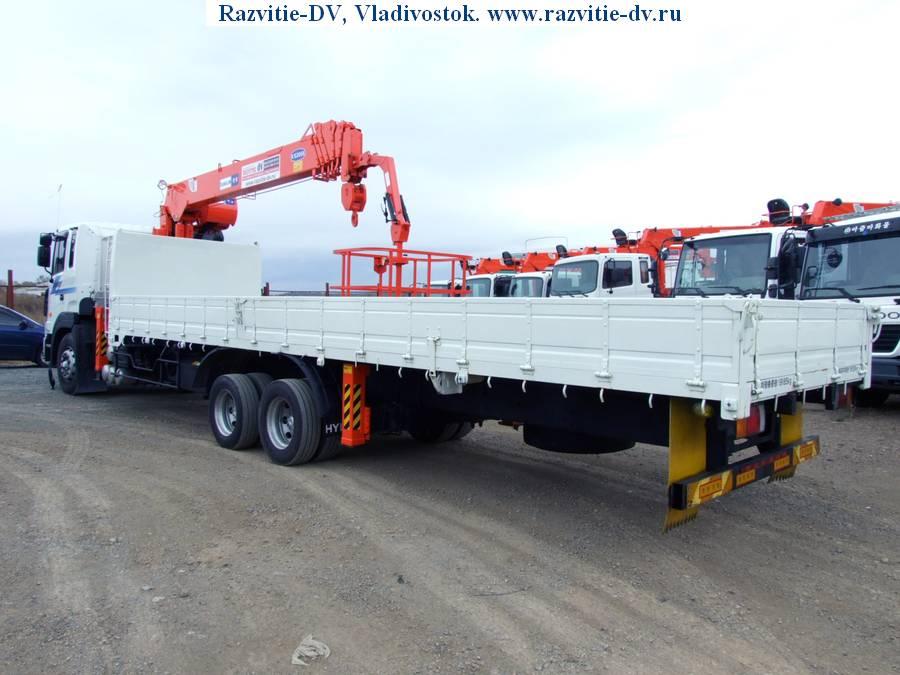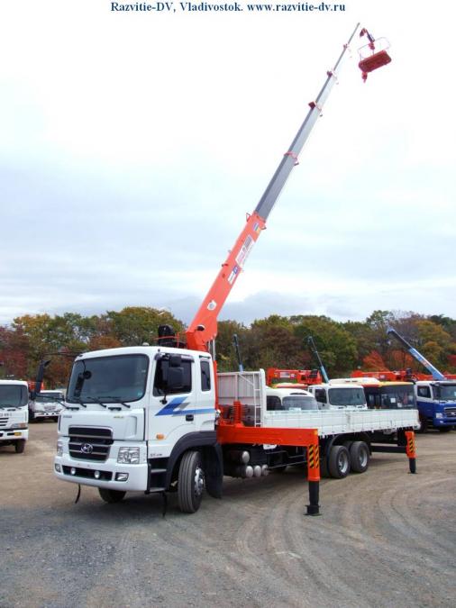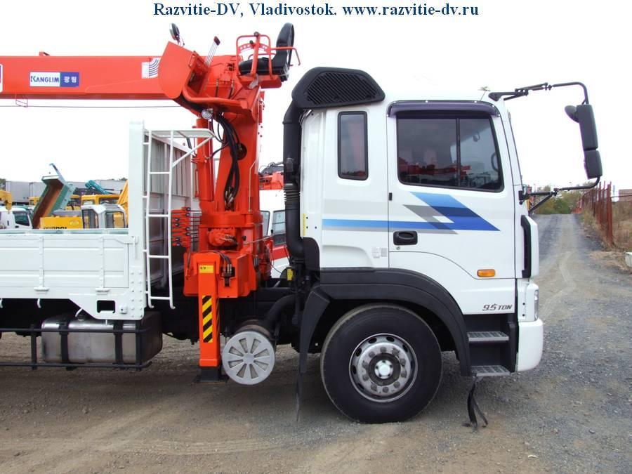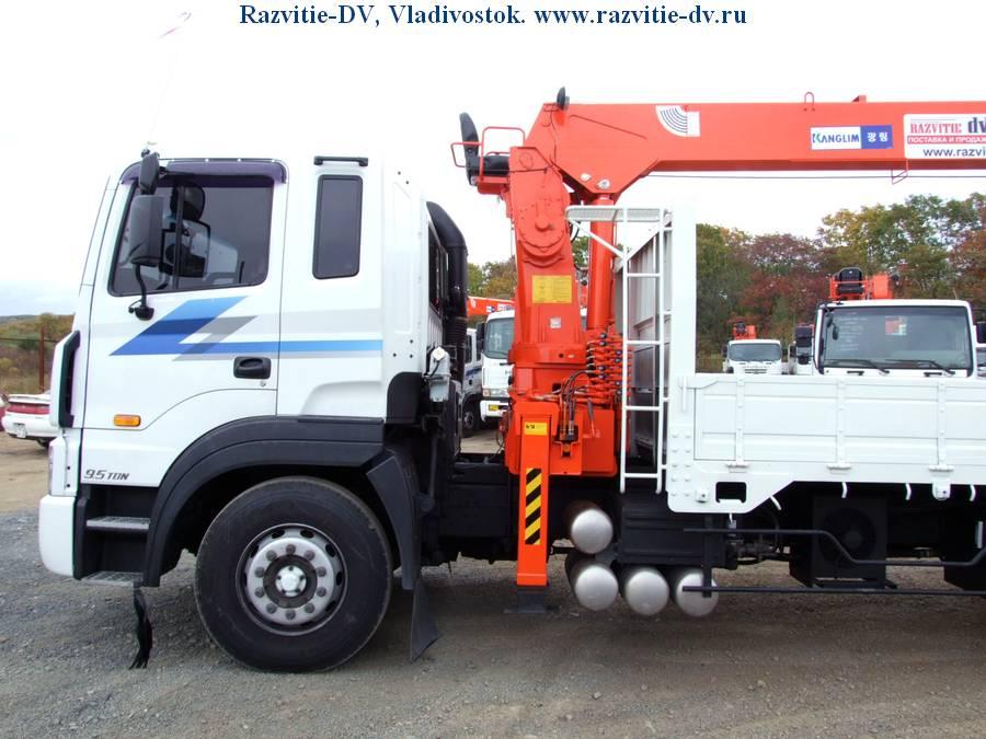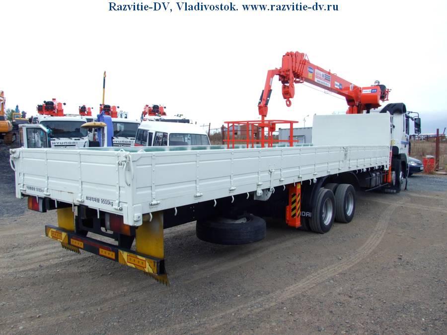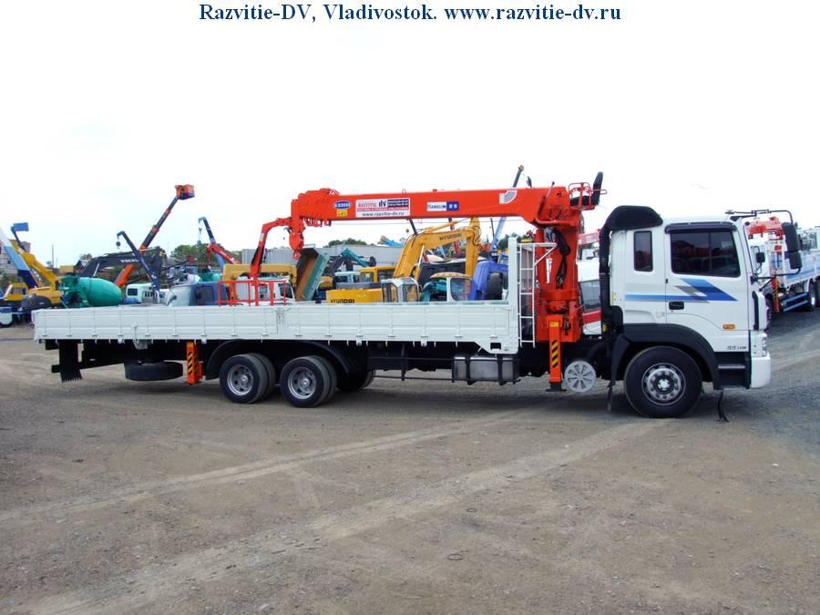 Бортовой грузовик с крановой установкой, 3 оси, грузоподъемность: борт - 9.5 тонн; стрела - 7.1 тонн. Новая двухцилиндровая стрела марки Kanglim 2056. Максимальная высота вылета - 23.3 м. Модель двигателя: D6AB, 290л.с. Турботаймер. Шестиступенчатая коробка передач. Блокировка межосевого дифференциала. Длина борта - 9.15 м, ширина - 2.30 м. Количество мест - 2 + спальник. Четыре аутригера. Полная предпродажная подготовка, замена всех жидкостей, масел, фильтров.