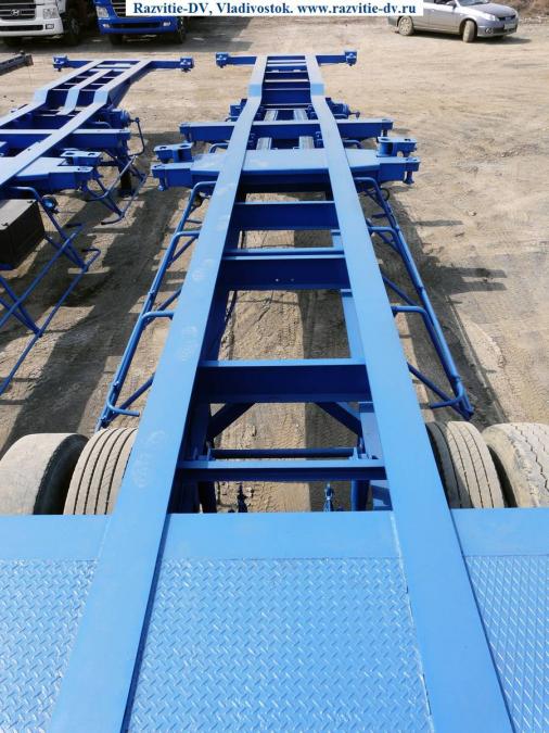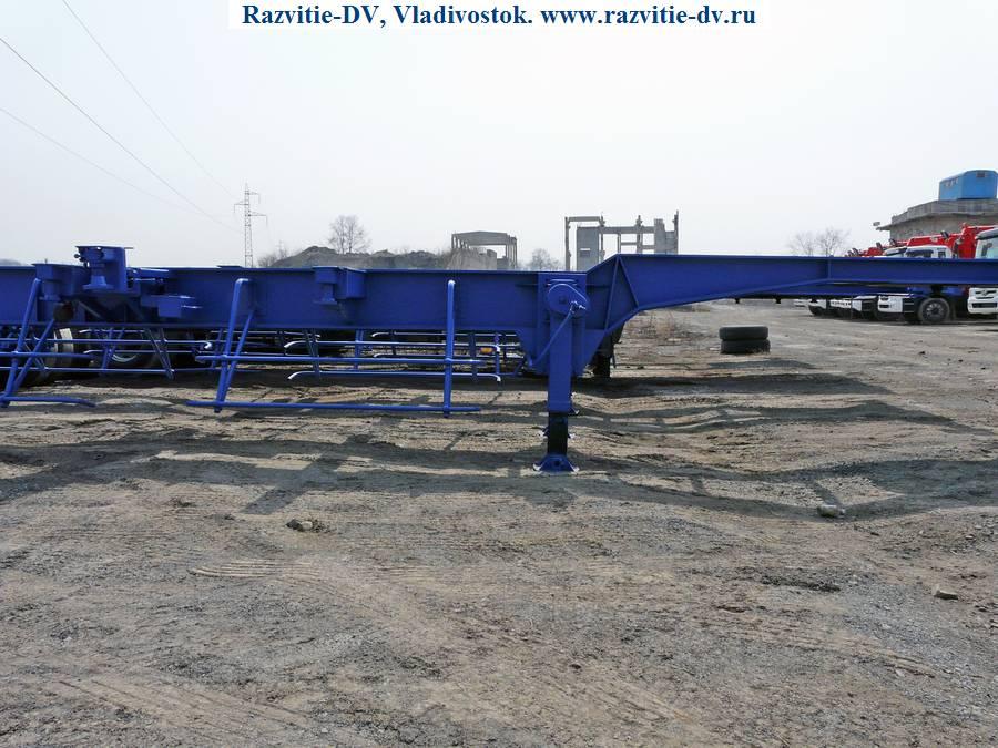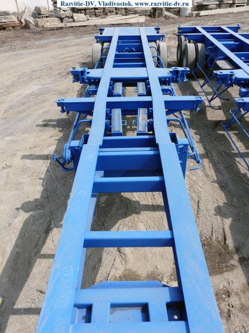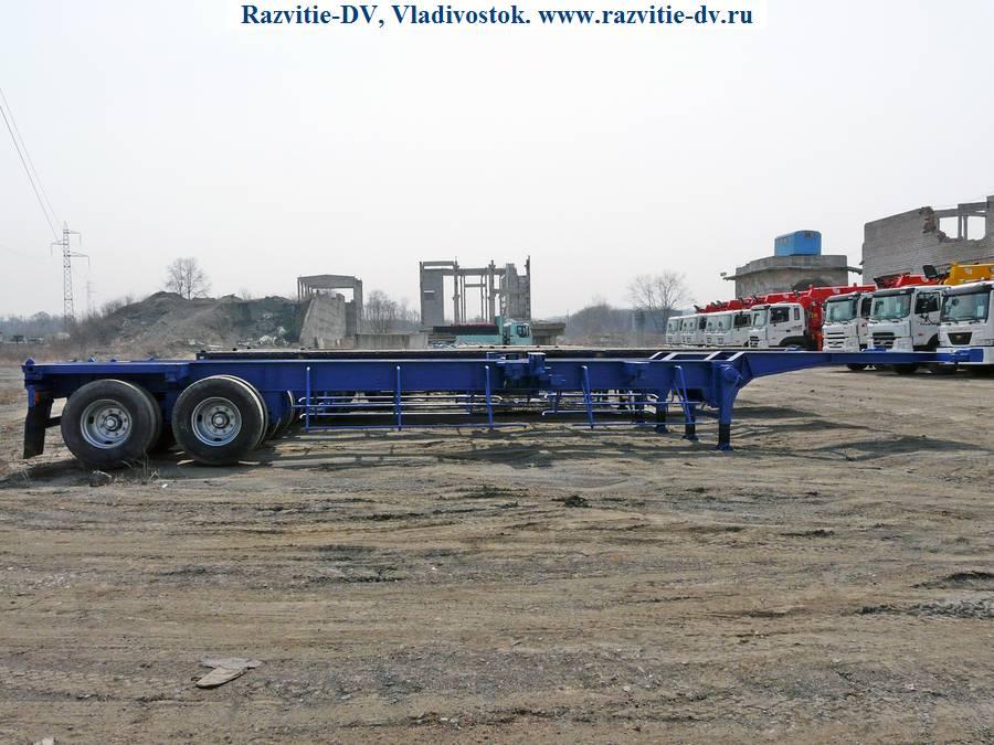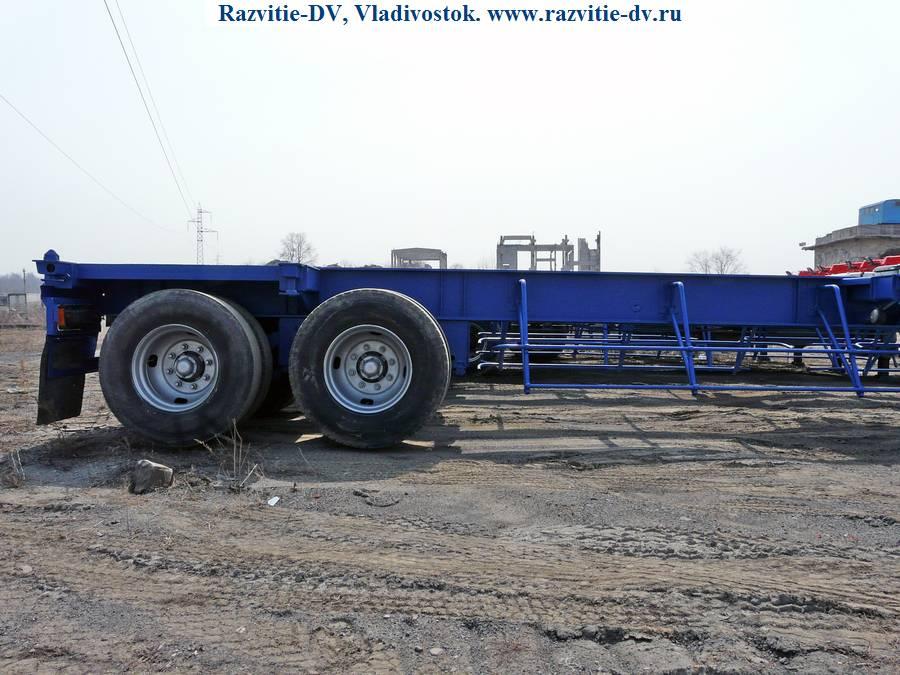 Двухосный полуприцеп - контейнеровоз (горбатка) для перевозки одного 40-футового или двух 20-футовых контейнеров, с возможностью перевозки одного 20-футового контейнера посередине прицепа. Длина - 12.4 м, ширина - 2.4 м, грузоподъёмность - 25 т. VIN - 3277