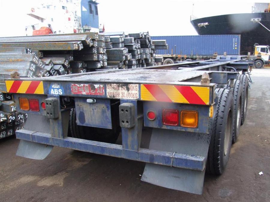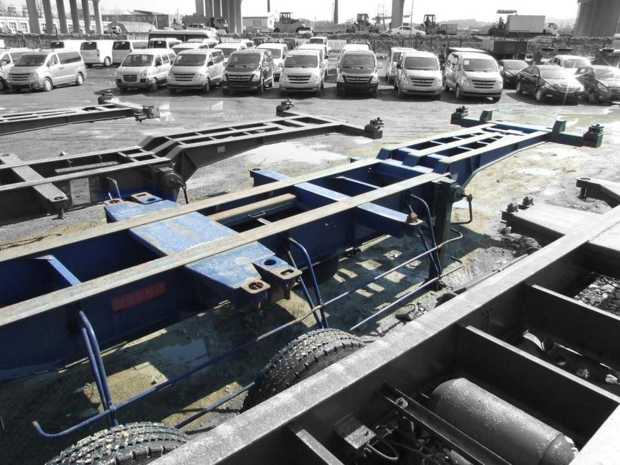 Новая резина. Трехосный полуприцеп - контейнеровоз (горбатка) для перевозки одного 40-футового или двух 20-футовых контейнеров, с возможностью перевозки одного 20-футового контейнера посередине прицепа. Радиус колёс - 22.5. Длина - 12.4 м, ширина - 2.4 м, грузоподъёмность - 25 т. Производство - Южная Корея. VIN – 0002