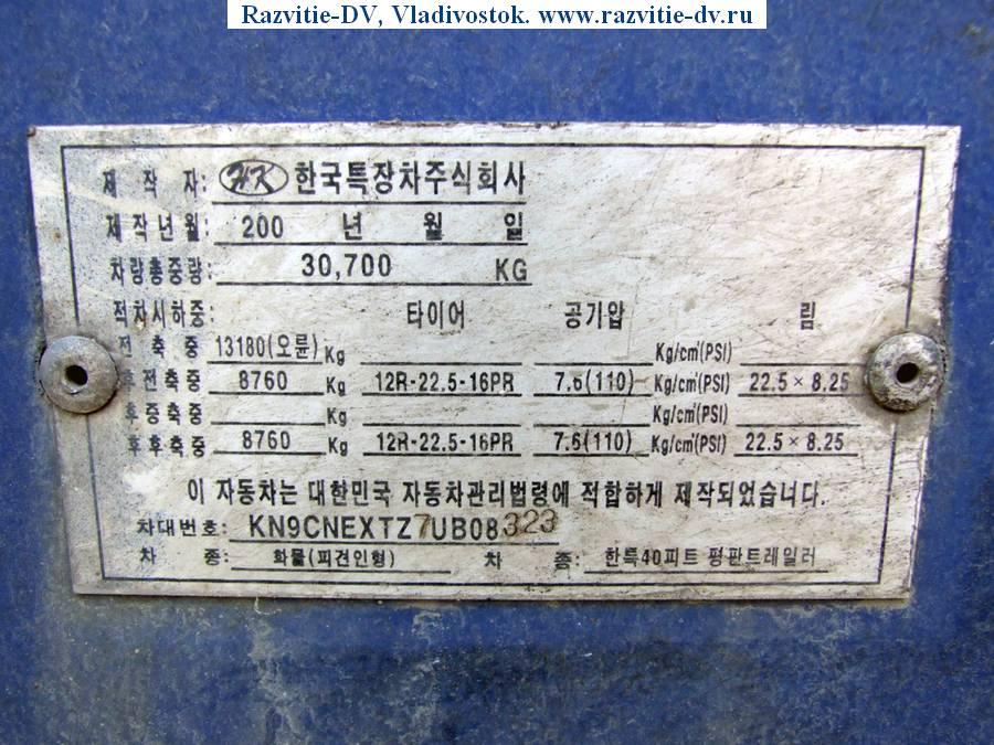Двухосный полуприцеп - площадка под один 40-футовый или два 20-футовых контейнера, длина прицепа - 12.40 м, ширина - 2.40 м, колёса - 22.5, разрешённая максимальная масса - 30.7 т., грузоподъёмность - 24 т. VIN - 8323