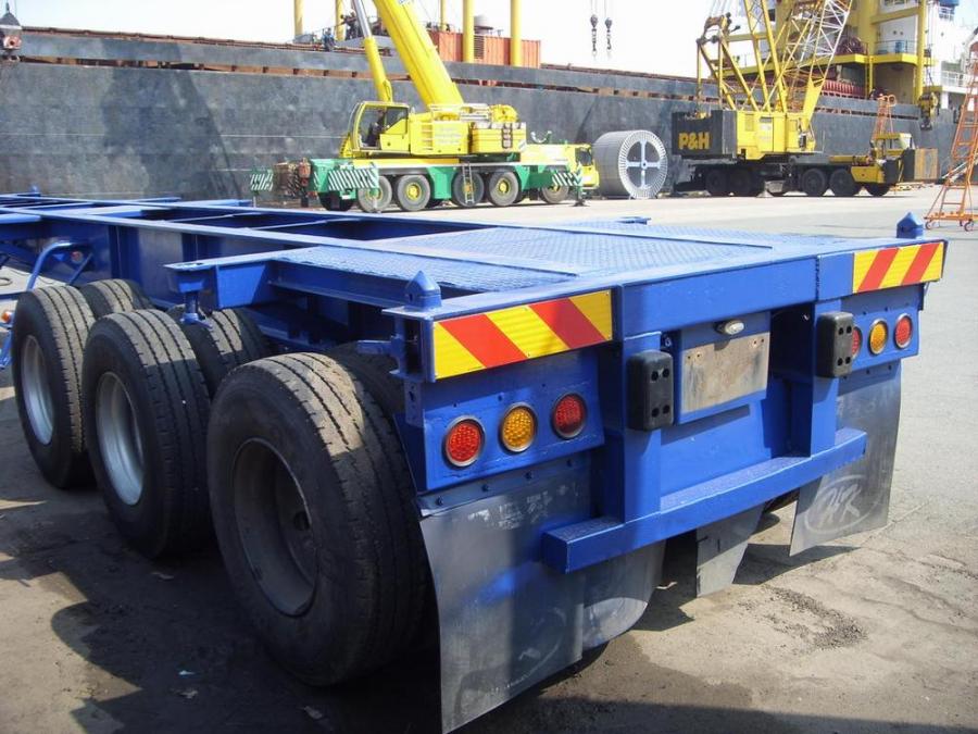 Новая резина! Трёхосный полуприцеп-контейнеровоз, под один 40-футовый или два 20-футовых контейнера, с возможностью перевозки одного 20-футового контейнера с размещением по центру прицепа. Грузоподъёмность - 25 т. Длина - 12.3 м, ширина - 2.4 м. Радиус колёс - 22,5. Производство - Южная Корея. VIN – 0020
