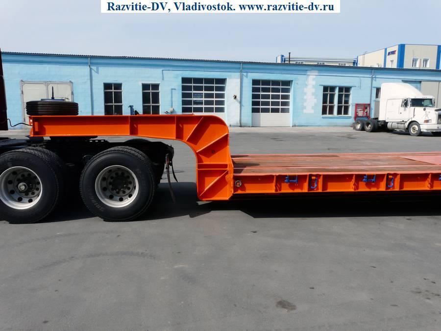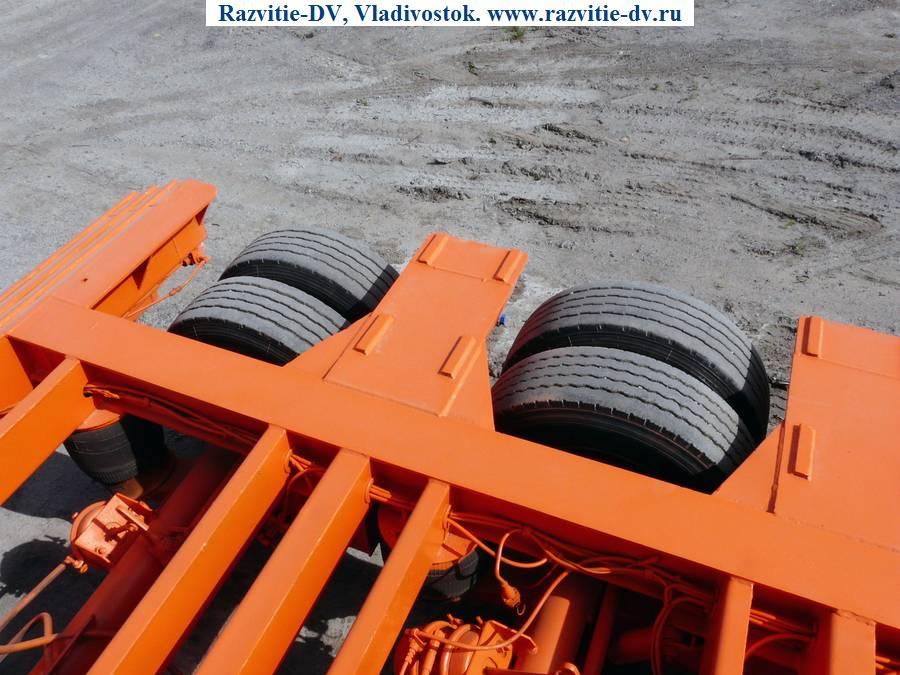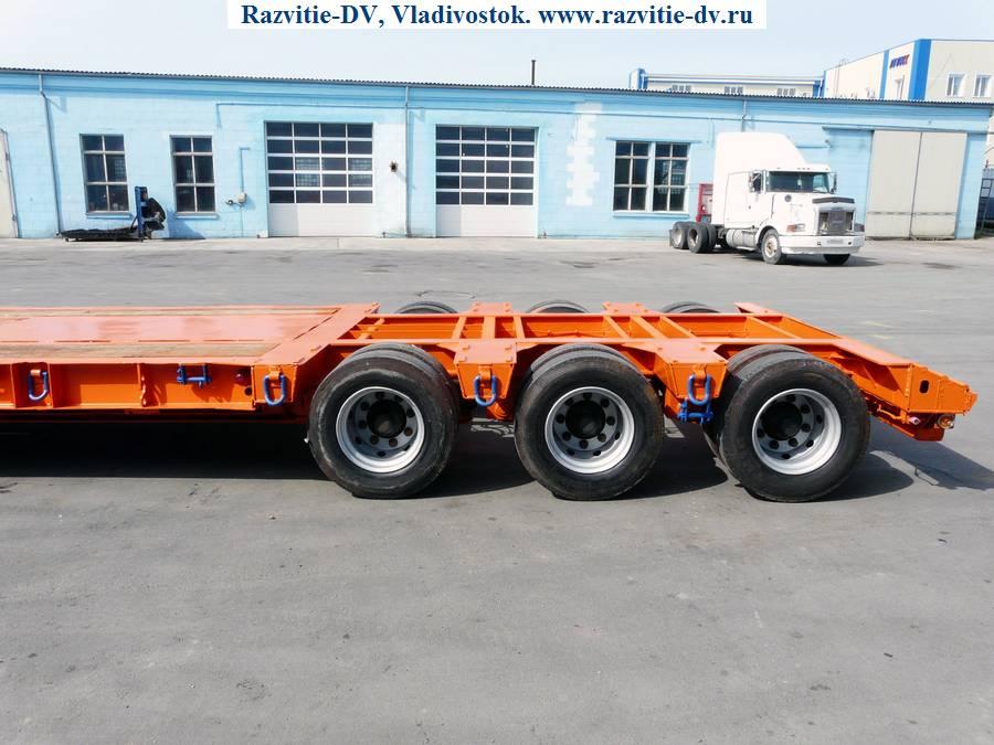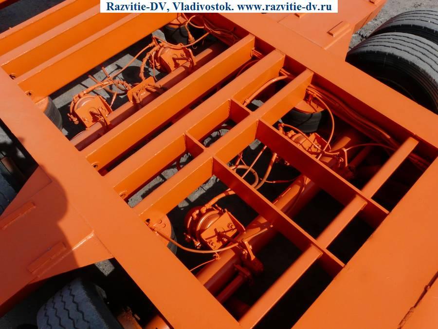 Трэйлер для перевозки спецтехники, грузоподъёмность - 35 т, ширина - 2.7 м, длина - 12.5 м, три оси, 12 колёс, радиус колёс - 17.5. Высота рабочей площадки - 0.75 м, длина от клюва до первой оси - 6 м, от клюва до конца трала - 9.50 м. Подвеска на пневмоподушках. VIN - 0016