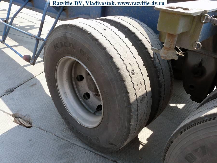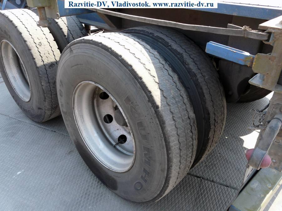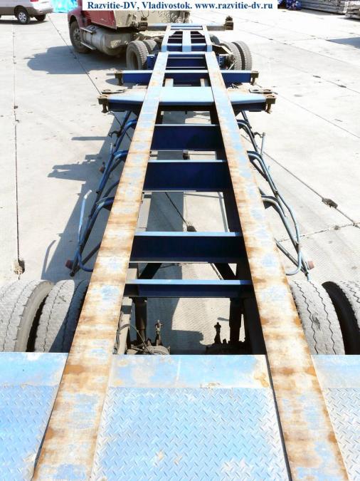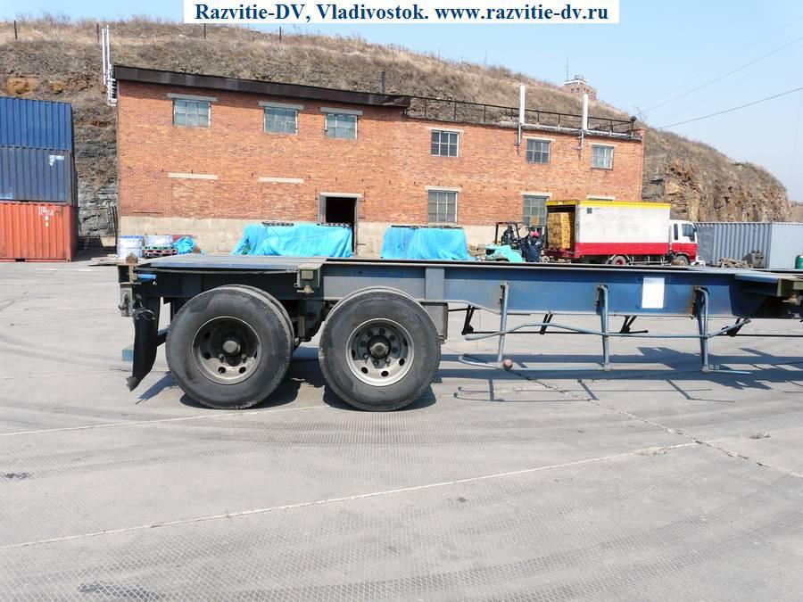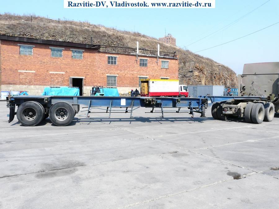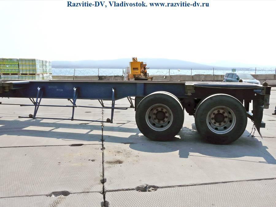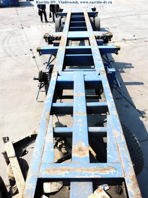 Двухосный полуприцеп - контейнеровоз "горбатка" для перевозки одного 40-футового или двух 20-футовых контейнеров, с возможностью перевозки одного 20-футового контейнера посередине прицепа. Длина - 12.4 м, ширина - 2.4 м, грузоподъёмность - 25 т. Радиус колёс - 22.5. VIN - 9619